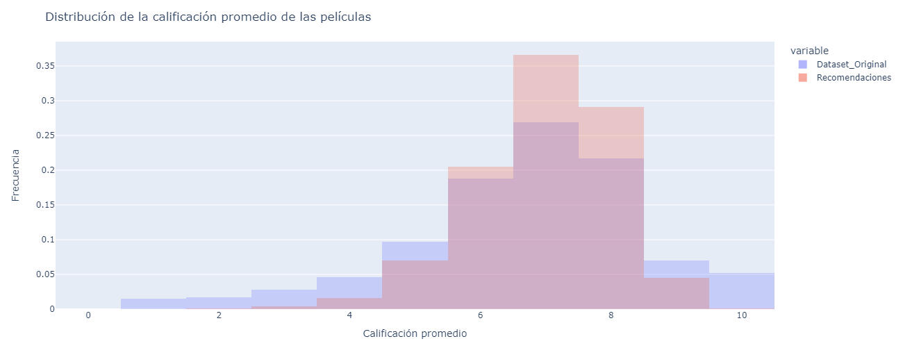 Este gráfico muestra la cantidad de películas por género en ambos datasets y permite comparar cuáles son los géneros más populares en cada uno. En el eje x se encuentran los géneros y en el eje y la cantidad de películas de cada género.Al observar el gráfico se puede ver que los géneros de drama y crimen son los más populares tanto en el dataset original como en el de recomendaciones, sin embargo, el género de acción es más popular en el dataset de recomendaciones que en el original. También se puede apreciar que el género de comedia tiene más películas en el dataset original que en el de recomendaciones. Esta información puede ser útil para entender las preferencias de los usuarios y mejorar los algoritmos de recomendación.