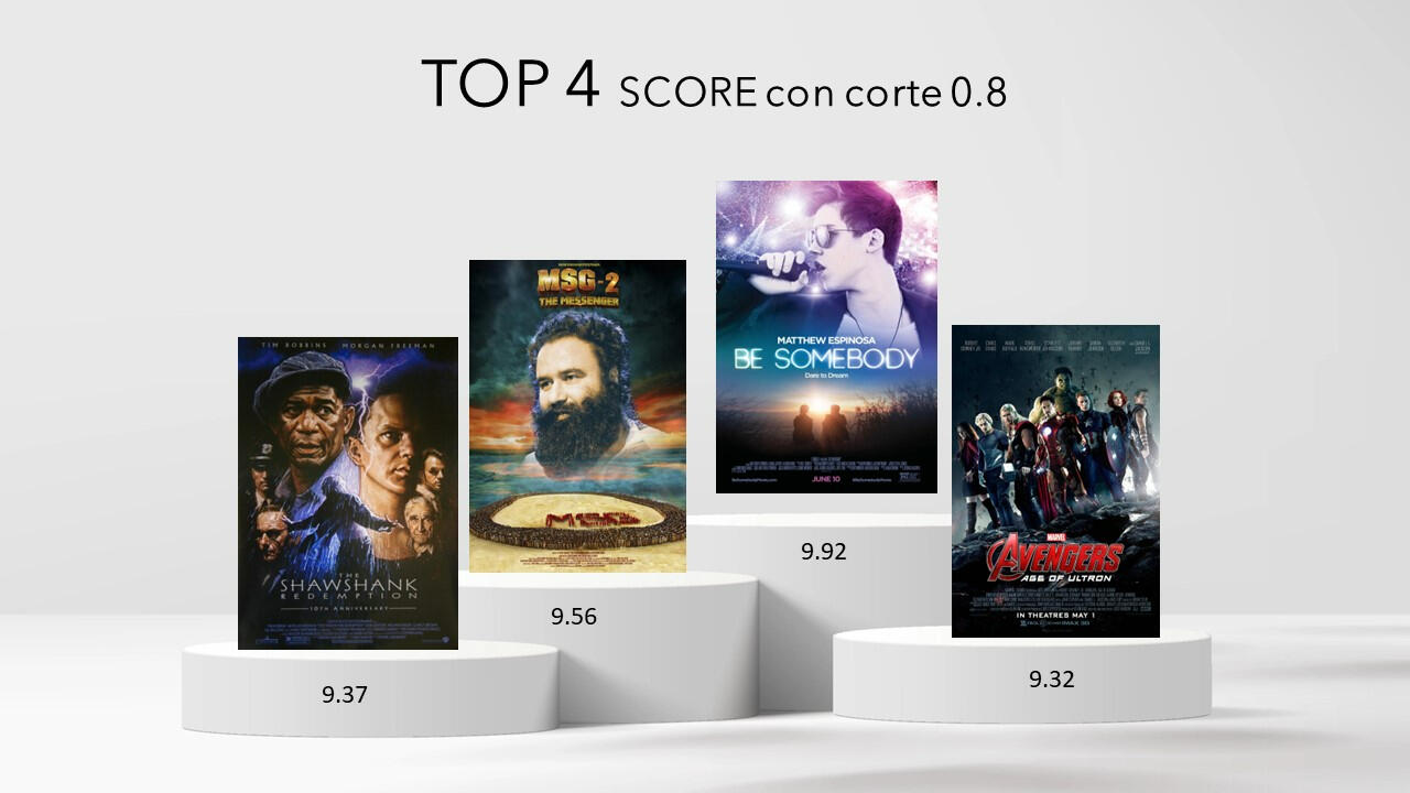 Resumiendo el ranking a los 4 primeros, podemos observar en la imagen las películas y sus scores calculados.Adicionalmente podemos destacar en orden de relevancia los siguientes géneros: